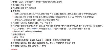 2025 전국 중진작가 초대전 -자료접수 10월25일마감.전시장소 나주시문화회관전시기간 11월24일 ~11월30일참가비 1점당 7만원분야 미술 평면,입체작품자료제출 출품원서 웹하드다운로드문의 회장 장복수 010 2975 1101/ 총무 01 9059 9579-