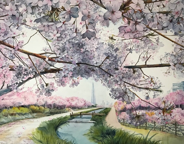 벚꽃엔딩 페이지 정보 작성자꿈꾸는달 조회 472회 작성일 2022-12-12 17:41:52 댓글 0 list_alt목록 본문 벚꽃엔딩-20호Watercolor on paper-아스라이 보이는 도시의 실루엣은 바쁜 일상을 상징하지만벚꽃 아래 있는 이 순간만큼은 꽃잎과 물소리에 가려져 아득하게 느껴집니다. 멀리 떠나지 않아도 곁에 머물고 있던 벚꽃의 끝자락에서 봄의 축복을 발견합니다. - arrow_back arrow_forward list_alt 댓글 0 등록된 댓글이 없습니다.