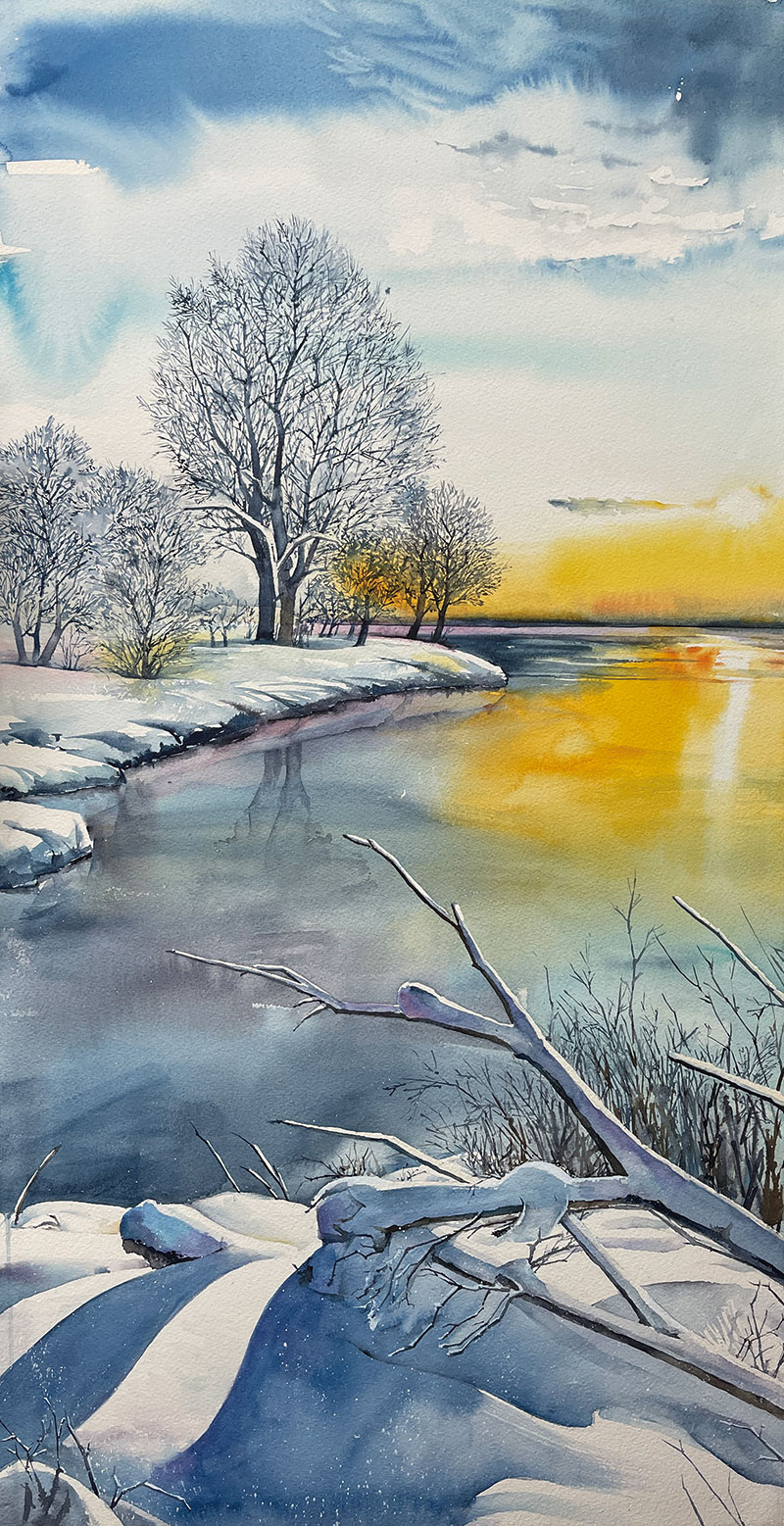 겨울날인상 25 페이지 정보 작성자꿈꾸는달 조회 39회 작성일 2026-01-21 19:58:31 댓글 0 list_alt목록 본문 겨울날인상 25-400 × 800Watercolor on Paper- 눈으로 덮인 강변과 앙상한 나무들은 정지된 듯 보이지만, 수면 위에 번지는 노란 빛은 하루의 끝이자 또 다른 시작을 암시한다. 차가운 청색과 회백의 공간 속에 스며든 따뜻한 색채는 겨울이라는 계절이 품고 있는 이중적인 고요와 희망 또는 멈춤과 흐름을 동시에 드러낸다. arrow_forward list_alt 댓글 0 등록된 댓글이 없습니다.