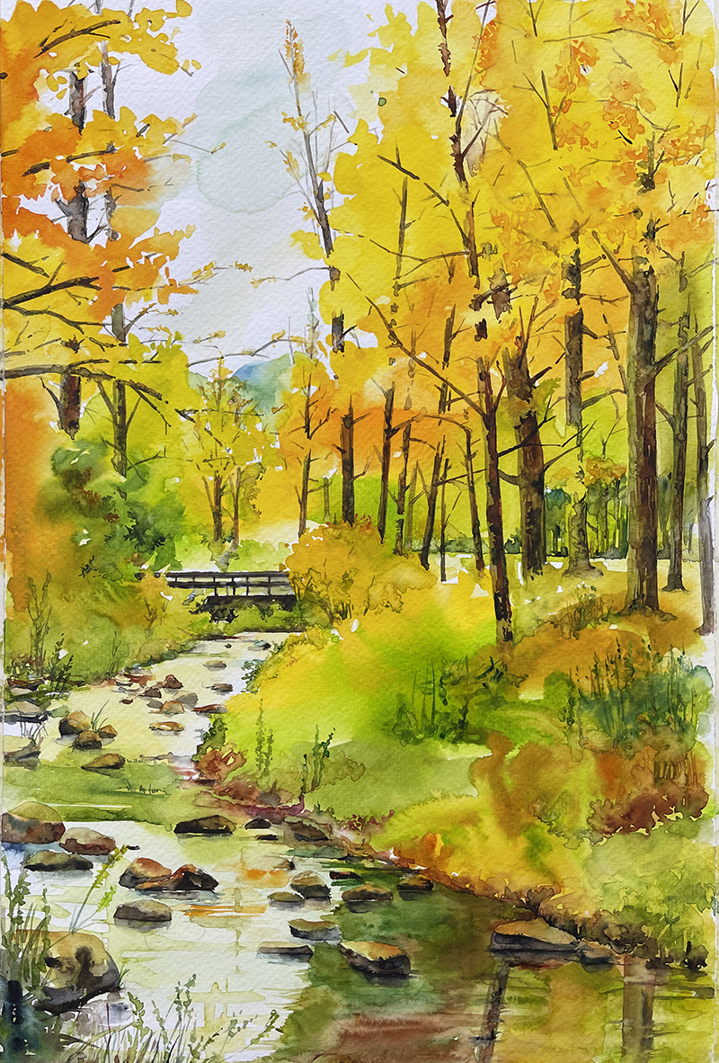 배경의 밝고 Wet-on-wet 기법은 아련하고 몽환적인 가을의 공기를 담아냅니다.